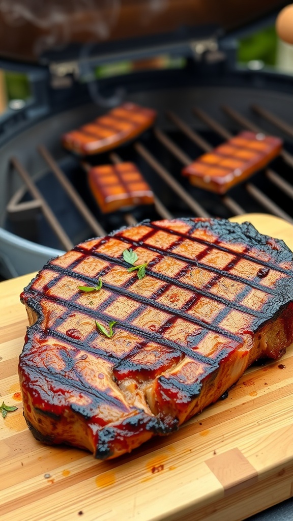 The sight of a beautifully grilled T-bone steak resting on a wooden cutting board is enough to make any BBQ enthusiast's heart race. With stunning grill marks and a rich brown crust, this steak is not just a meal, it's a celebration of flavors.